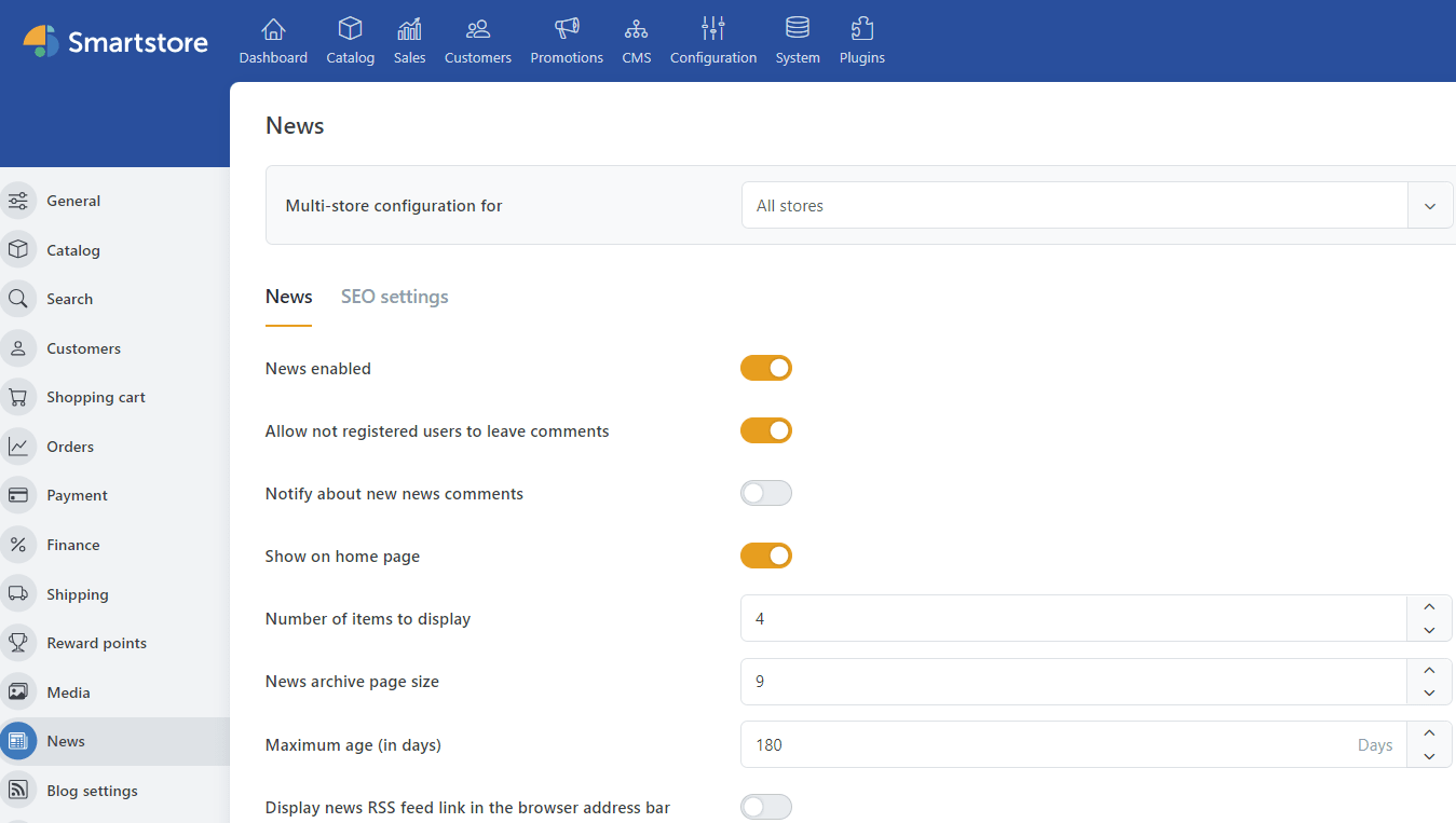 2. After clicking Install, the news plugin is available in the shop. Under Configuration > Settings, the plugin is listed under News. In this area, store owners can enable or disable the plugin and make further configurations.