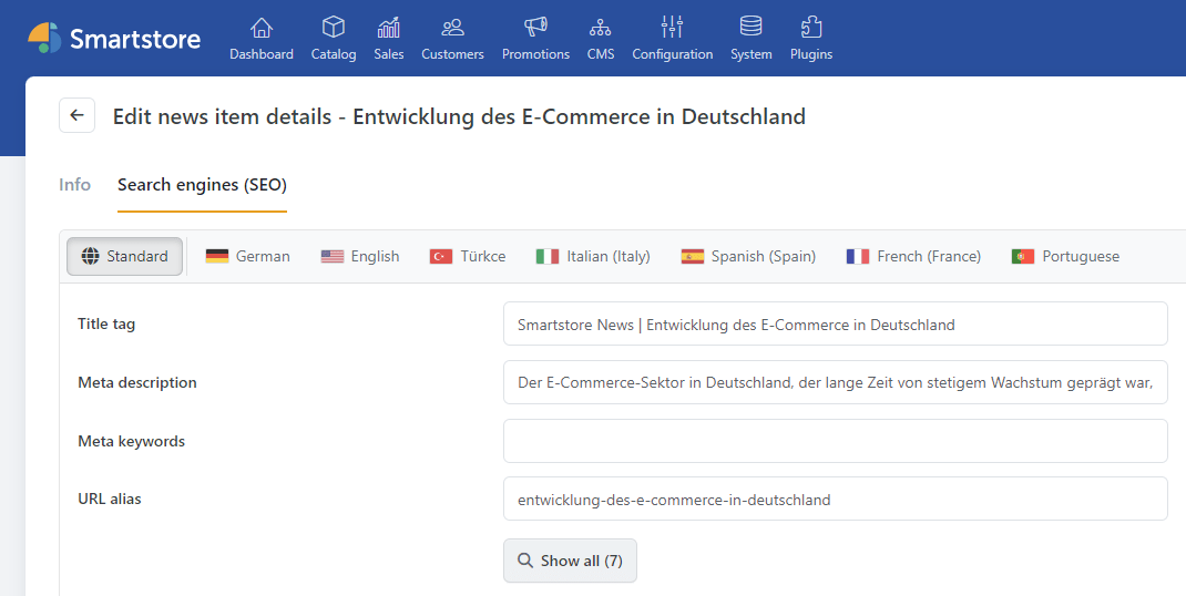 If you want to reach an even larger and especially international audience and have imported corresponding language resources into your Smartstore, these will appear as a selection at the top of the tab with the respective country flag.
