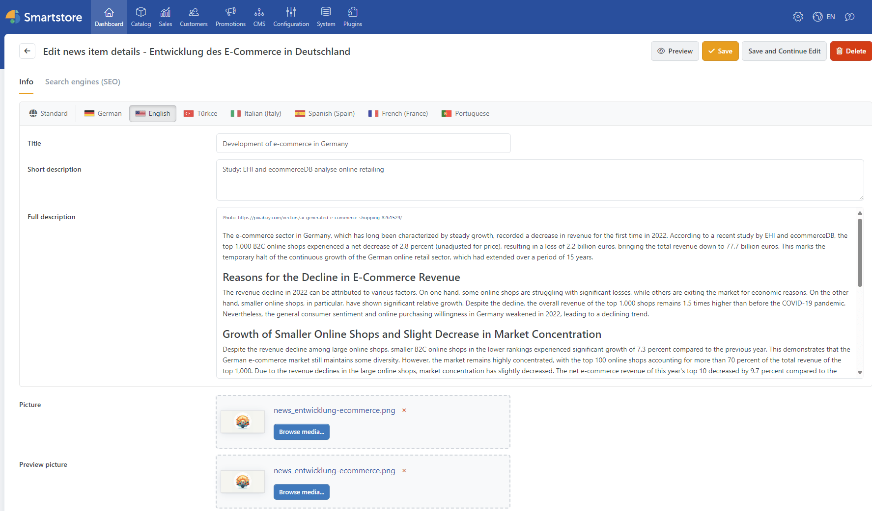 Here, you can either translate and insert everything manually or have all this conveniently done by the Smartstore Online Translator Plugin. The advantage: You only have to set up your shop in one language! After that, the tool takes care of the rest without negatively affecting the code structure.