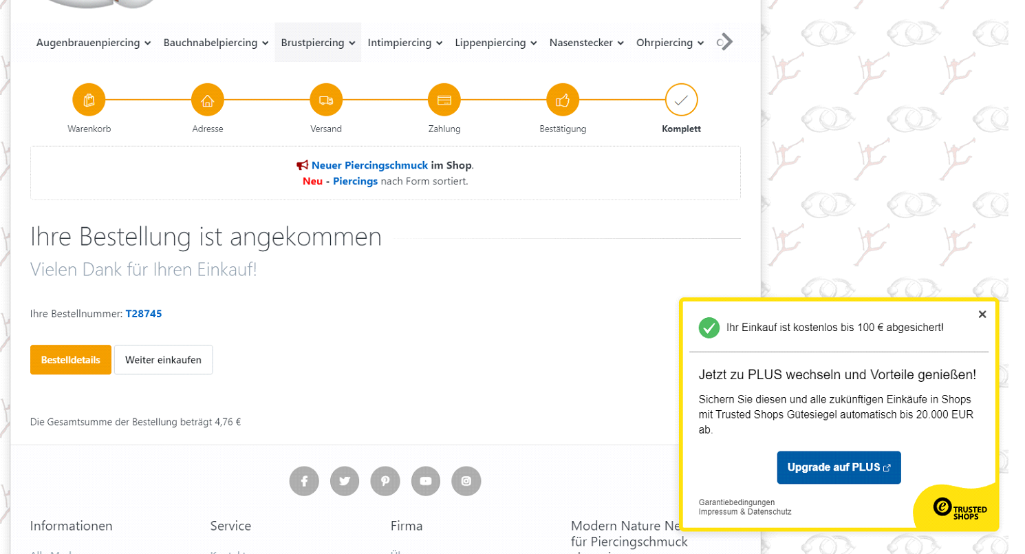 In the checkout process, the customer must indicate whether he wants to use the Trusted Shops customer protection and he agrees with a reminder (mail) to the store rating.